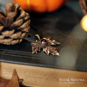This highly detailed 7.5cm-high pendant has been carefully crafted in soft, patinated gilded bronze and features a delicate fern branch. At its center is a magnificent 8mm rose-cut cabochon of faceted orange kyanite that is sure to play with the light. A brass clasp completes this piece. It comes with a black cotton cord approx. 43cm long, with a brass lobster clasp and an extension chain approx. 5cm long, enabling you to adapt the length of the jewel to your needs.